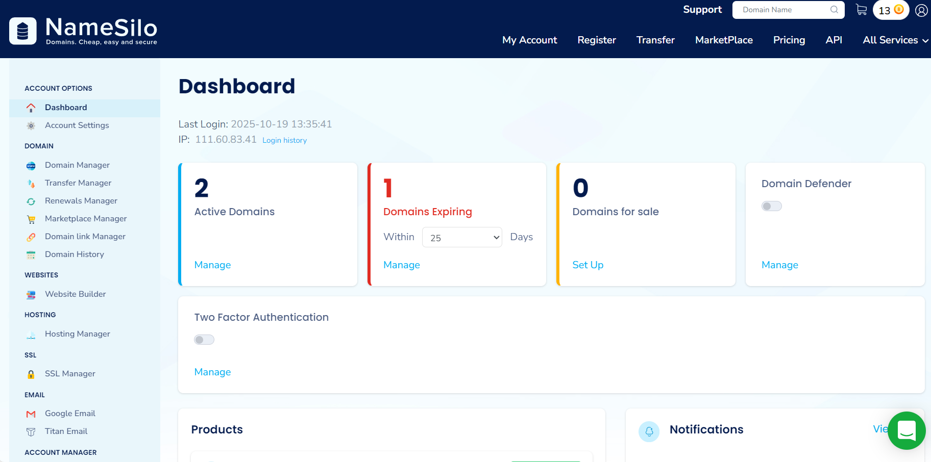 点击右上角头像,进入namesilo的控制面板,如图所示。
