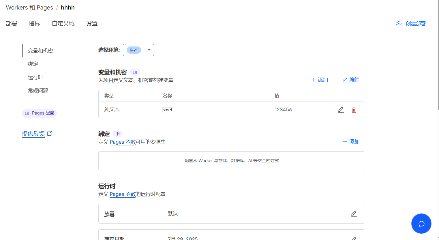 都是可以成功配置的。随后在“Page”中找到自己刚刚输入的项目名称,点击“设置”,在“变量与机密”中添加名称为“pswd”,内容为“123456”的纯文本变量。如图所示。
