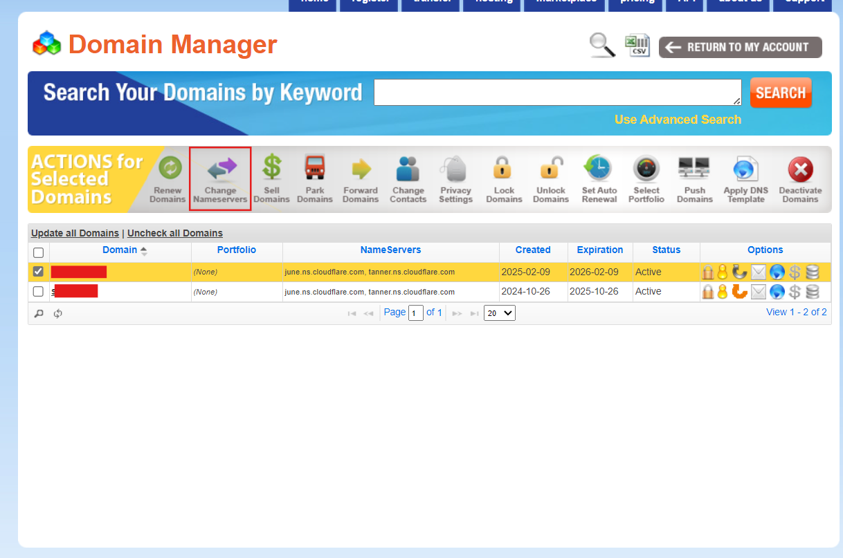 点击active damains下的“manage”按钮,找到自己刚刚购买的域名并且修改名称服务器为刚刚复制的Cloudflare名称服务器。