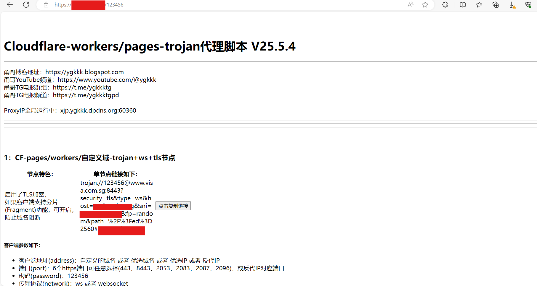 最后,输入自己刚刚自定义的域名/123456即可查看订阅地址。
