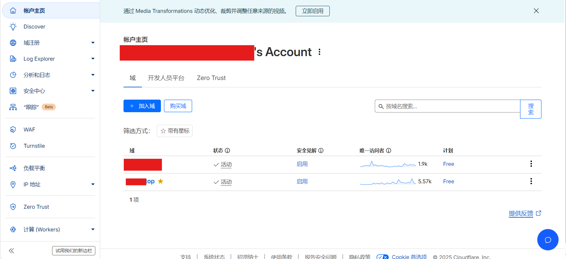 修改完成后等待一段时间(一般为10min-2h不等),就可以看到域名在Cloudflare的控制台中被显示出来。